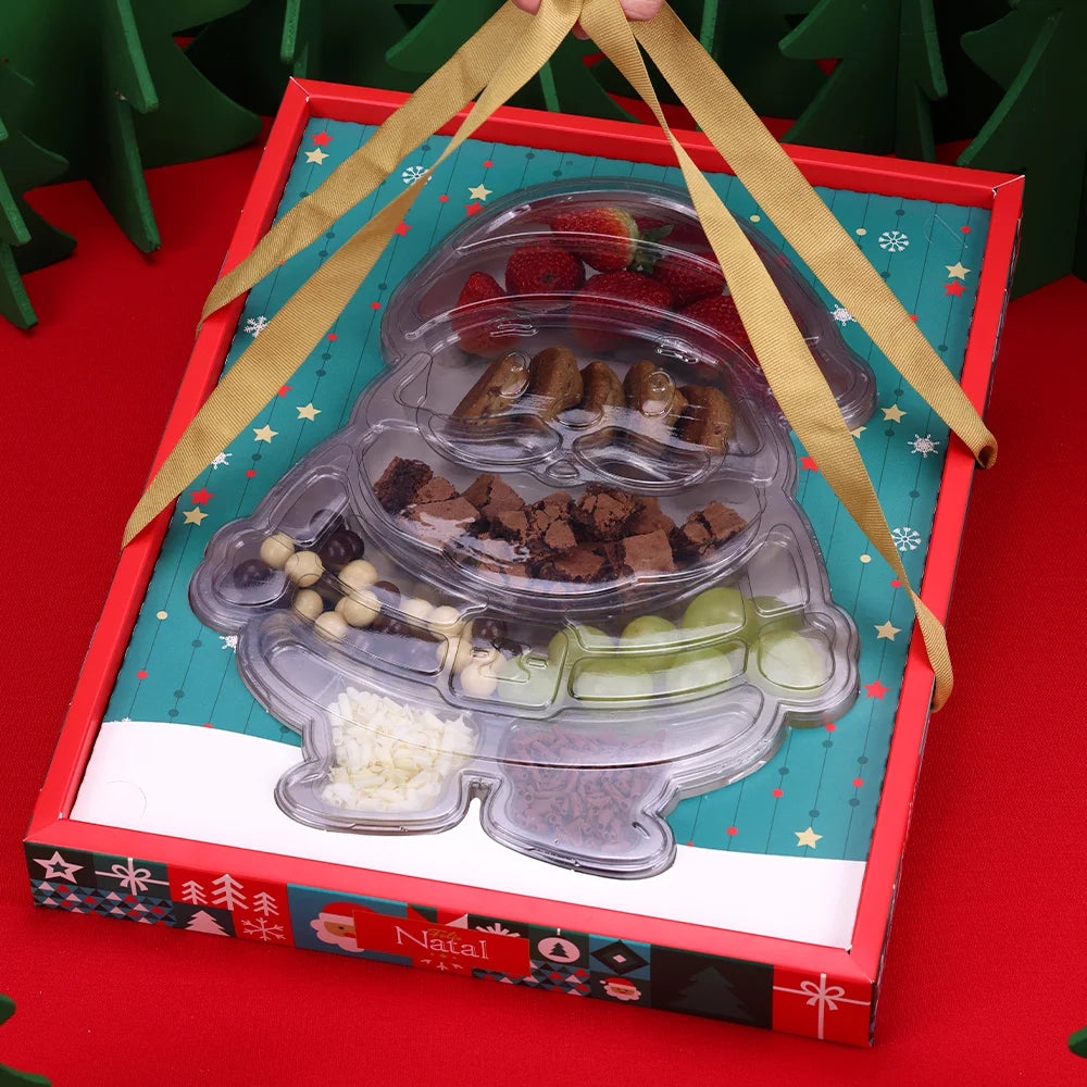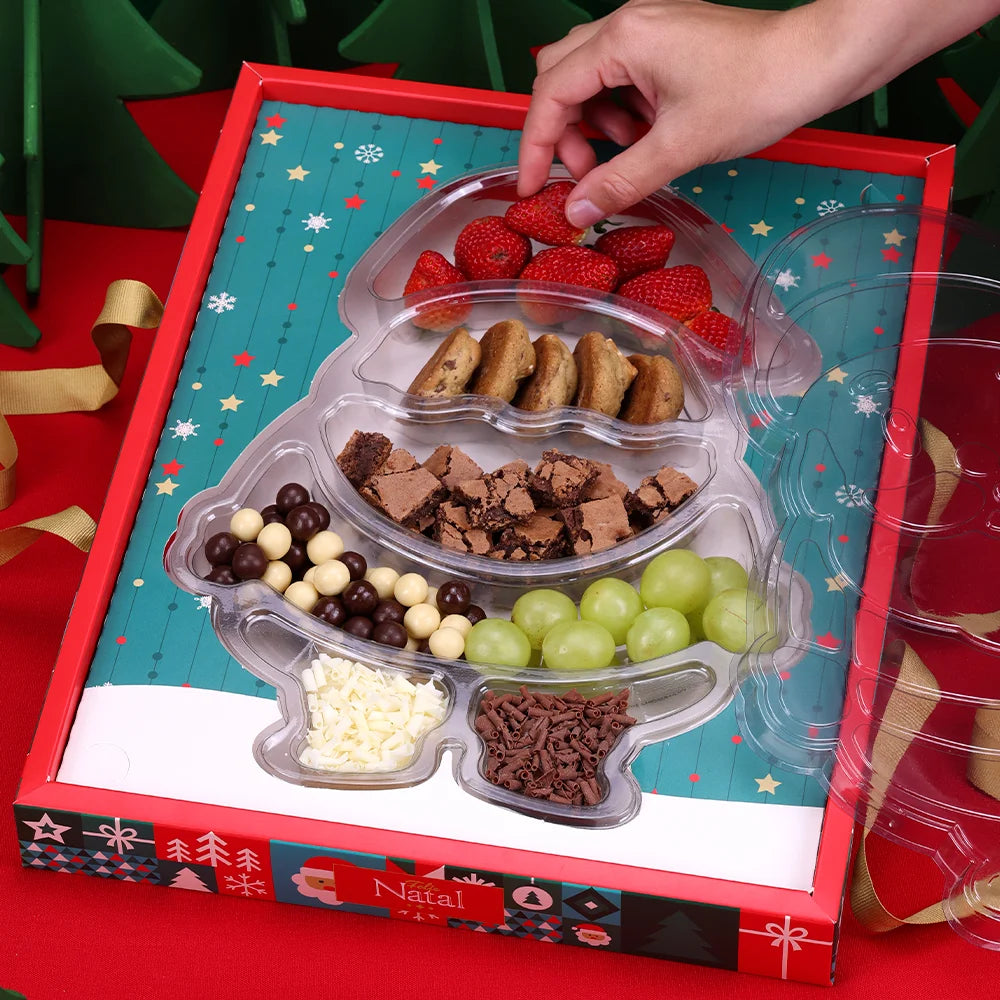 Laterais: Fundo vermelho com ilustrações natalinas variadas, como árvores de Natal, presentes e símbolos festivos em branco, verde e preto, criando um contraste alegre e moderno.