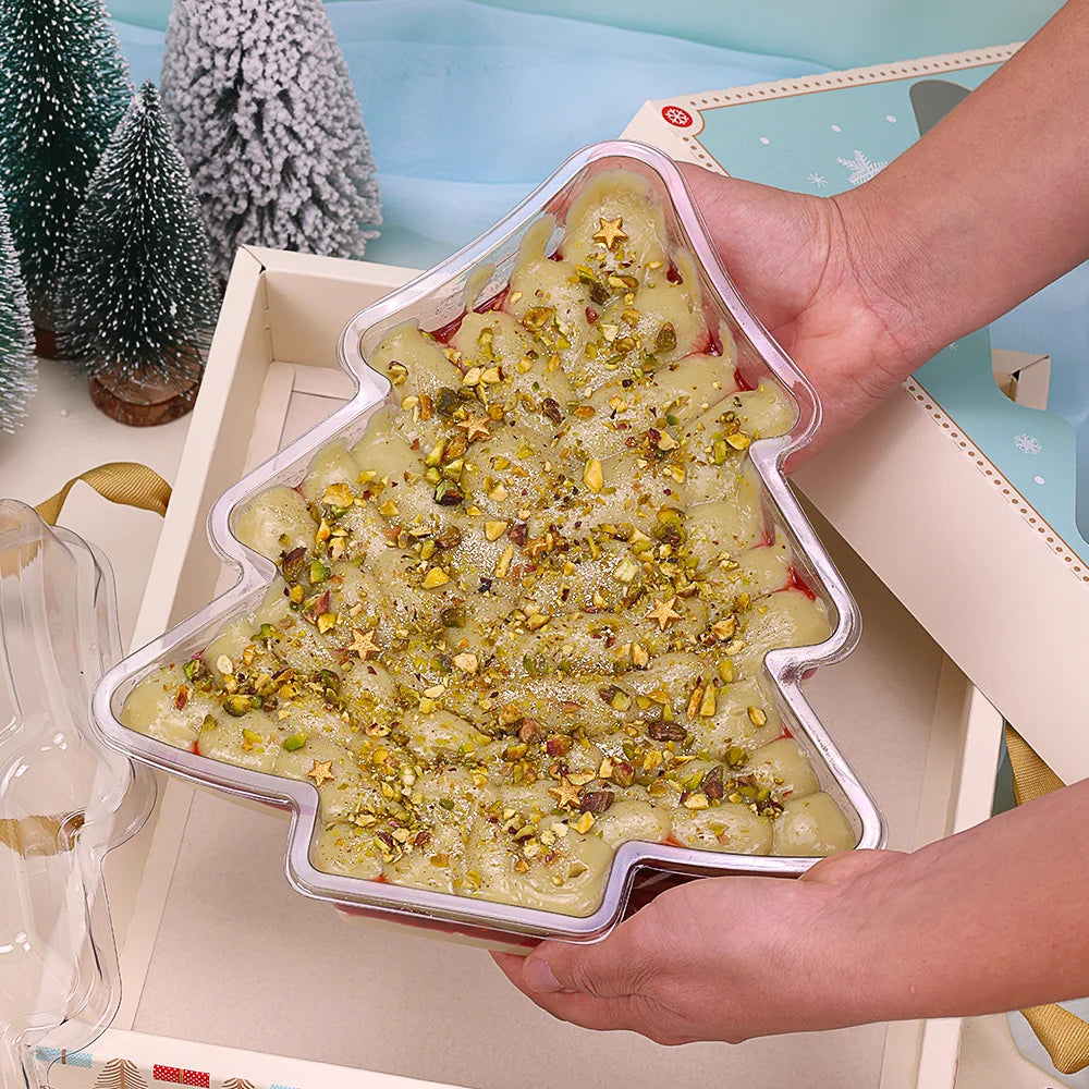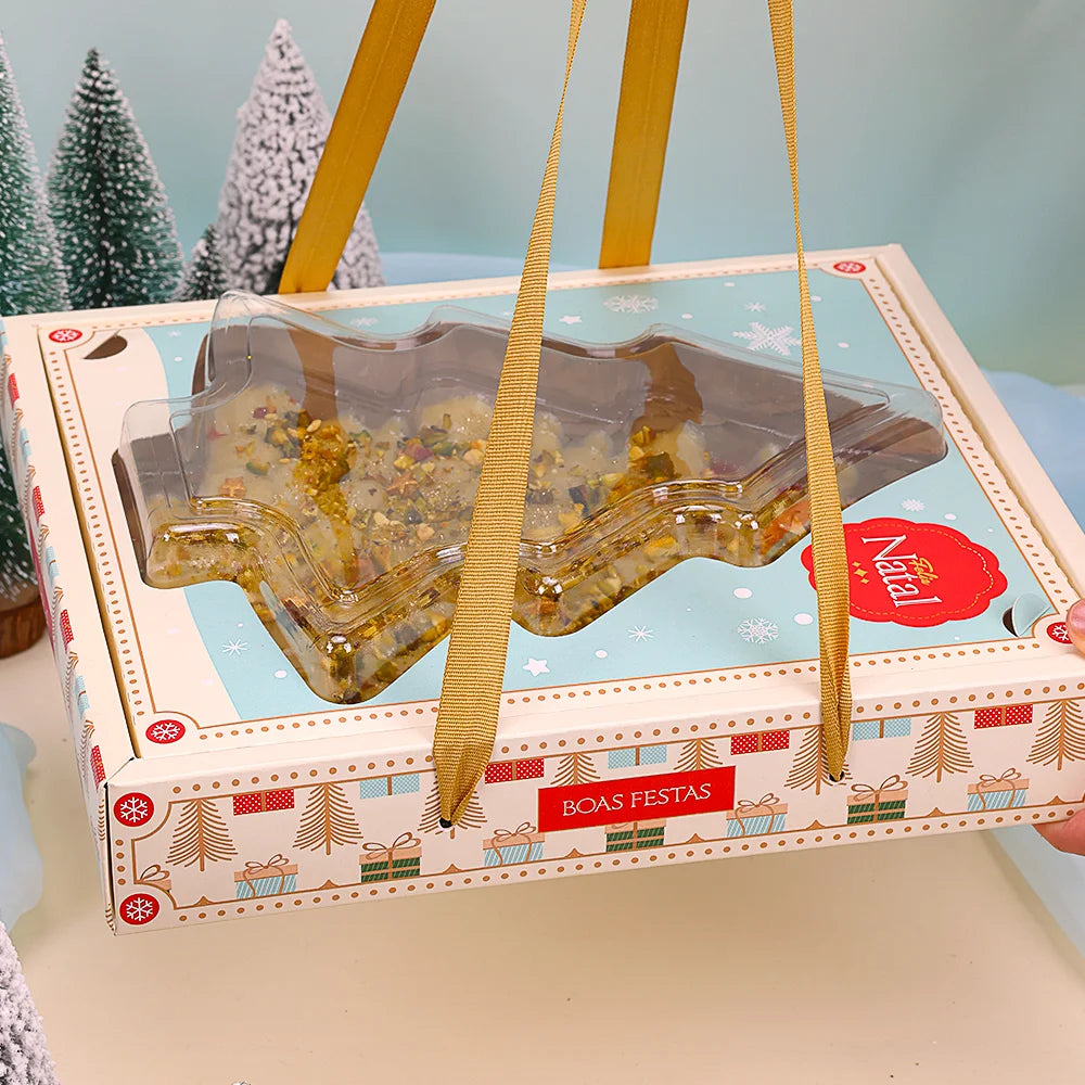 A parte externa da embalagem traz uma estampa delicada em azul claro com flocos de neve, transmitindo a atmosfera mágica do Natal.