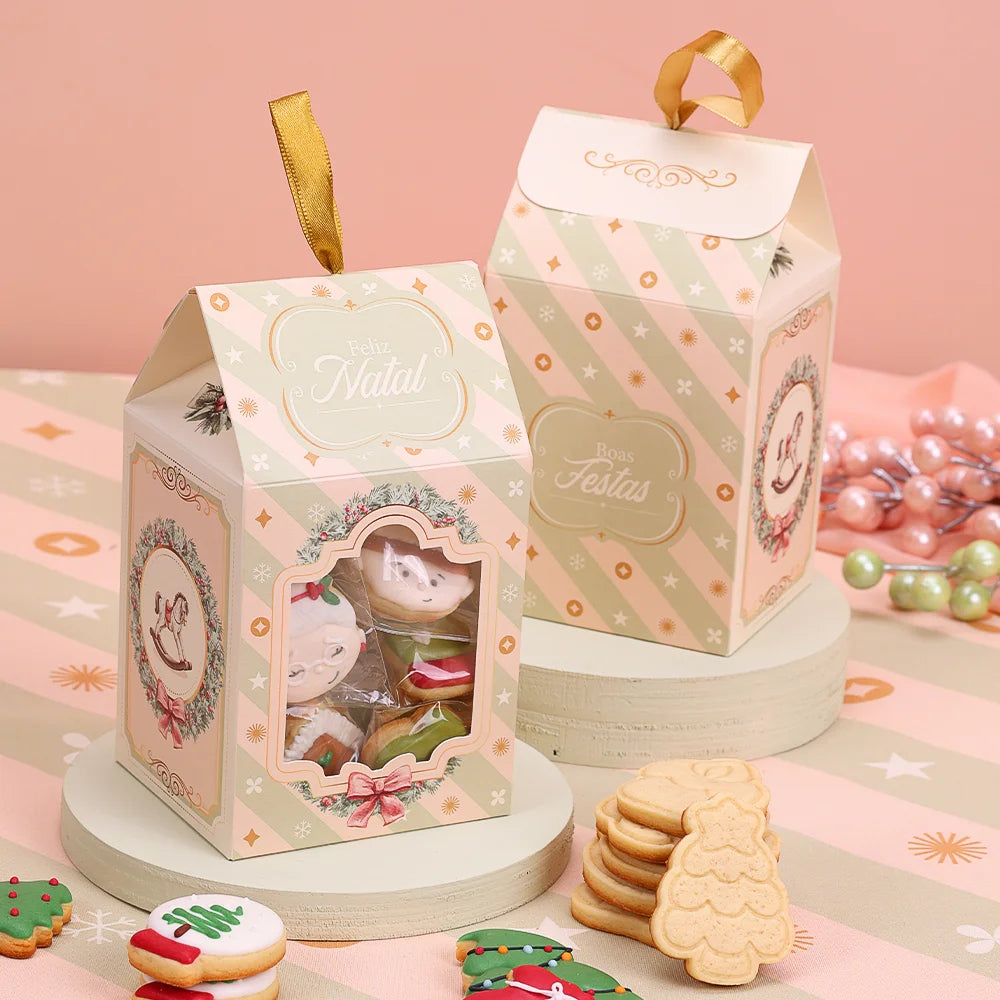 Frente: Moldura escrita a mensagem “Feliz Natal” em branco, visor rodeado por uma delicada guirlanda com laço rosado, em fundo de listras suaves em verde pistache e rosa claro, além de pequenos símbolos natalinos dourados.
