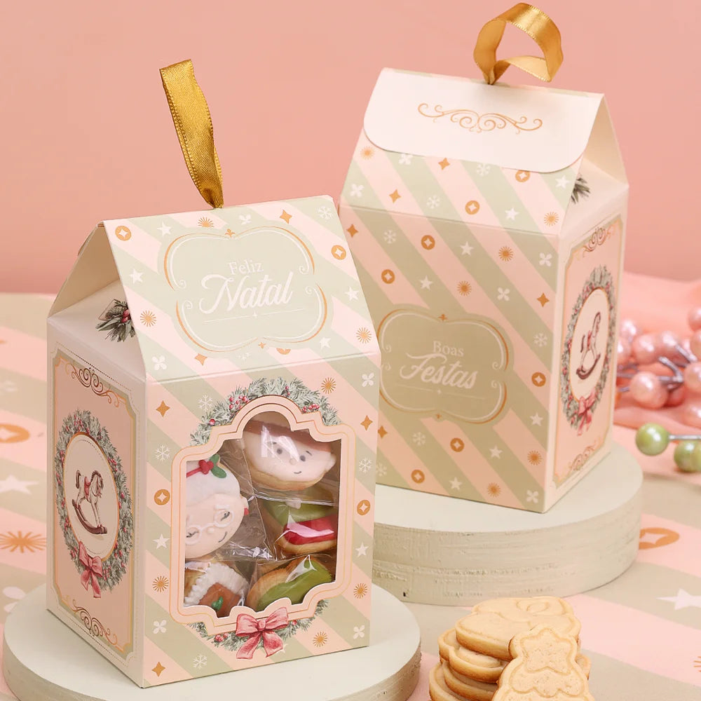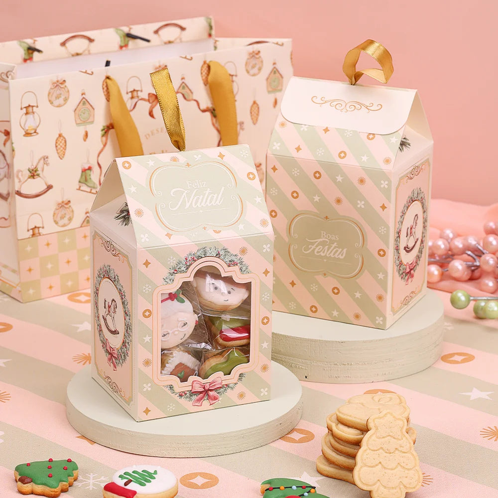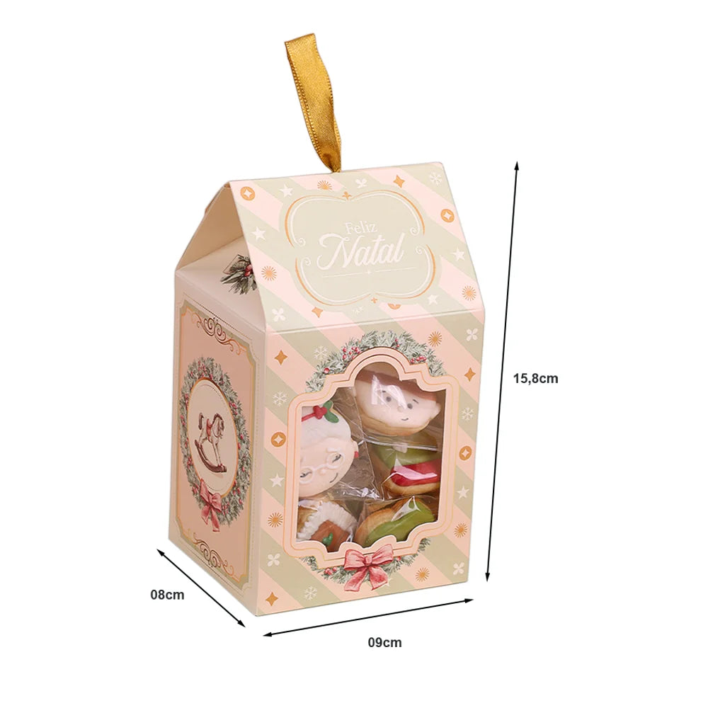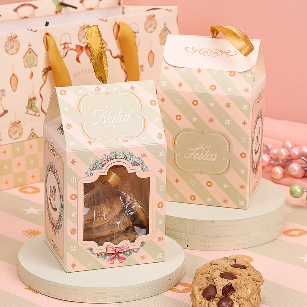 Verso: Moldura escrita a mensagem “Feliz Natal” em branco em fundo de listras suaves em verde pistache e rosa claro com pequenos símbolos natalinos.